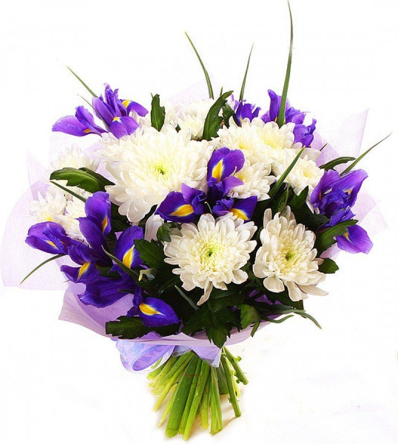 Утонченный и великолепный букет из загадочных фиолетовых ирисов и трепетных белых хризантем станет прекрасным вашим выбором в качестве знака внимания для человека, к которому вы испытываете искренние чувства, уважение и симпатию, так как сочетание этих цветов символизирует духовность и мудрость, искренность чувств и уважение.